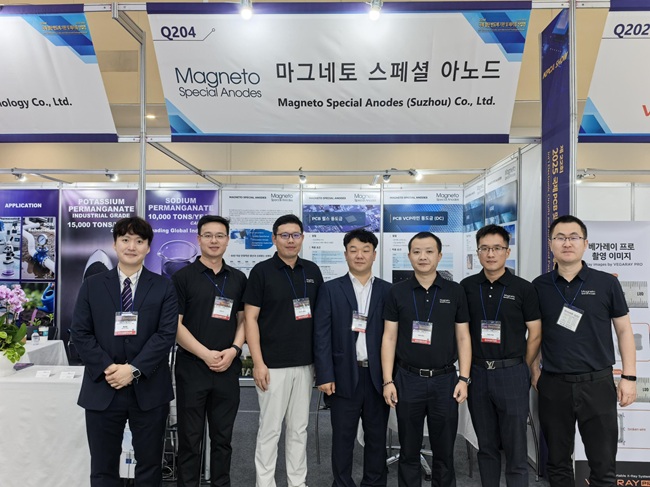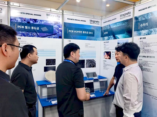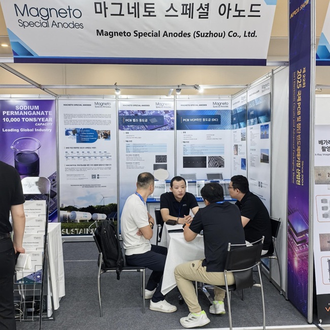 马赫内托携具备技术优势且经过成熟案例验证的不溶性钛阳极解决方案在本届展会精彩亮相。马赫内托重点展出了应用于垂直连续直流镀铜、反向脉冲镀铜、电解制氯和阴极保护的多款核心产品,向参展观众直观地呈现出马赫内托不溶性钛阳极产品在PCB电镀以及电化学水处理应用的性能优势,成为众多韩国企业驻足的焦点。