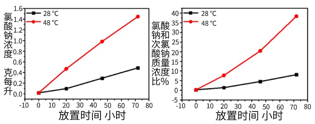 根据图7的数据,与现场无隔膜电解制取次氯酸钠水溶液产物浓度接近的7.5g/L次氯酸钠水溶液,在避光保存条件下三天内均发生持续分解。通过滴定氯酸钠浓度变化,发现次氯酸钠基本全部转化为氯酸钠,因此次氯酸钠浓度的衰减对应的是氯酸钠浓度的上升和氯酸钠/次氯酸钠比例的迅速增大,48度下三天后氯酸钠和次氯酸钠重量比高达40%。