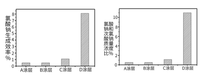 图4 不同阳极涂层对氯酸钠生成电流效率(左图)以及生成氯酸钠和次氯酸钠浓度质量比(右图)的影响(1000A/㎡,28℃,3wt%NaCl)