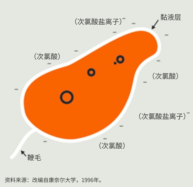 在微生物学上,经氯化消毒后的饮用水是安全的,因为病原体要么死亡,要么失去繁殖能力(被灭活),所以它们无法感染人类宿主。但氯是如何发挥其消毒作用,让人们可以安全饮水的呢?