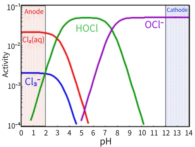 在水中添加氯后,会形成两种化学物质,合称游离氯。这些化学物质——次氯酸(HOCl,电中性)和次氯酸根离子(OCl⁻,电负性)的行为大有不同。次氯酸不仅比次氯酸根离子更具活性,而且是一种较强的消毒剂和氧化剂。虽然次氯酸根离子的反应性较低,但较长的接触时间可使其发挥足够的杀菌活性和消毒作用。