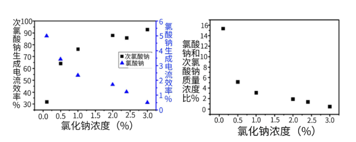 进水氯化钠浓度也会对氯酸钠生成电流效率产生较大影响。因氯化钠浓度低时电极电压偏高,一方面析氯效率快速下降,另一方面也更有利于氧化次氯酸根离子生成氯酸根。在氯化钠浓度从3.0%降至0.1%时,阳极电流密度不变的情况下次氯酸钠生成电流效率从93%降至32%,同时氯酸钠生成电流效率从0.5%升至5%,最终出水的氯酸钠和次氯酸钠质量浓度比从接近0升至15.2%。当然,一般次氯酸钠发生器不会将盐度降低,因此这一问题实践中影响可以忽略。